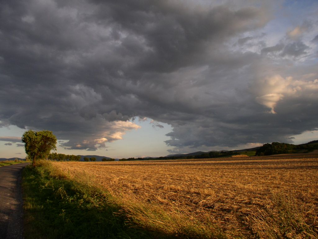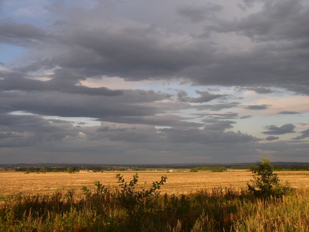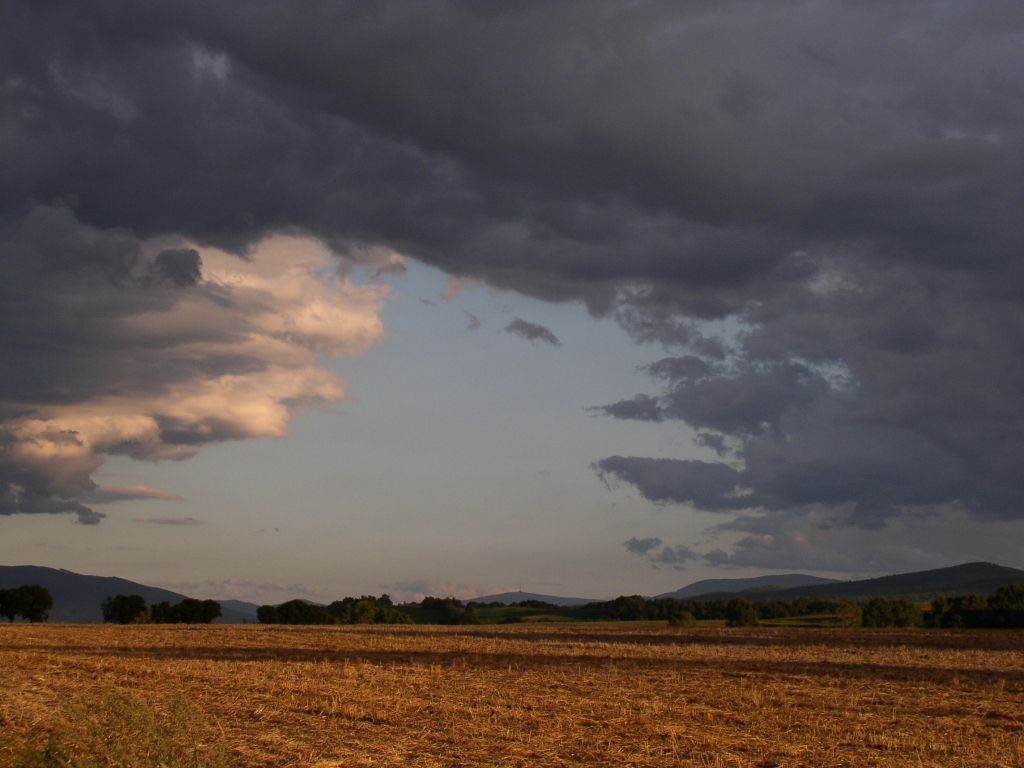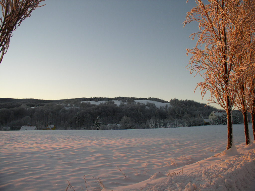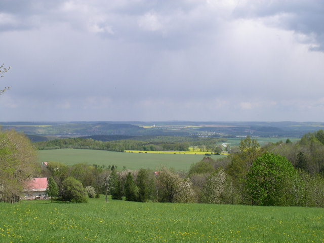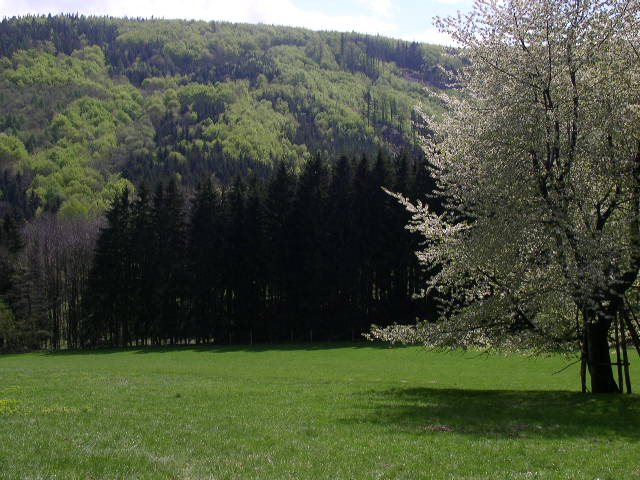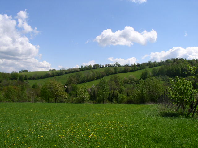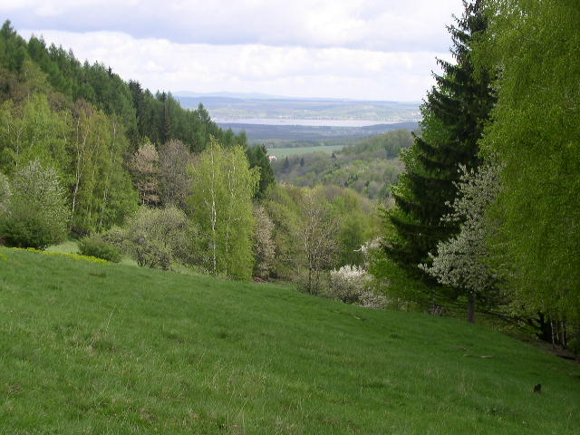 Z jedlovecké školky pohled na louky na Jedlovci. V dáli Borůvková hora
